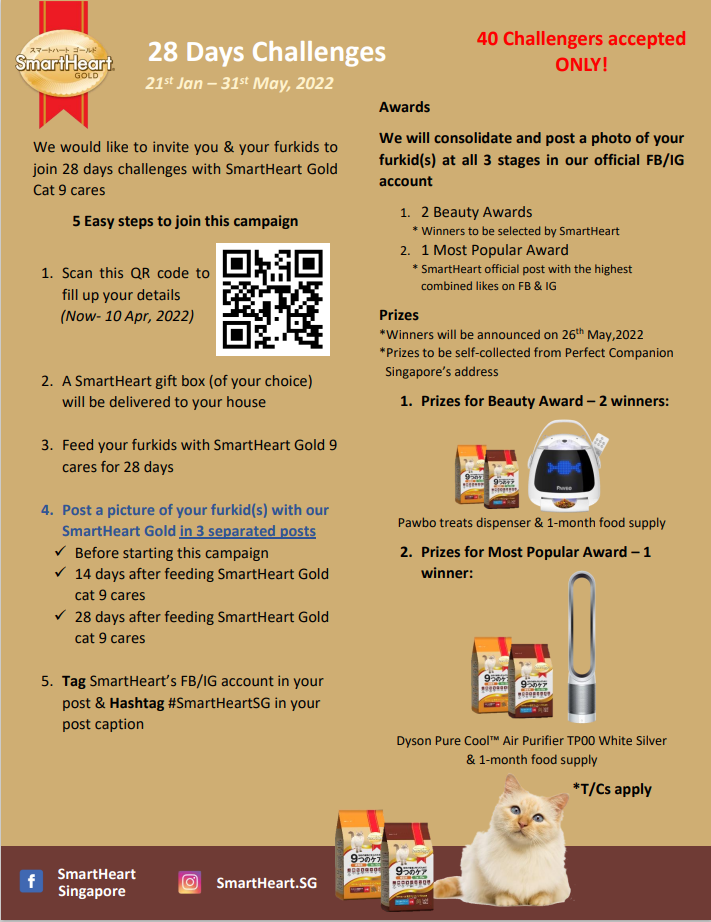 1. This activity is open to all residents of Singapore who are cat owners and at least 13 years of age at the time of entry. Participants below the age of eighteen (18) are required to obtain written parental/guardian approval to take part in the activity, and to provide that to the Organizer on request.